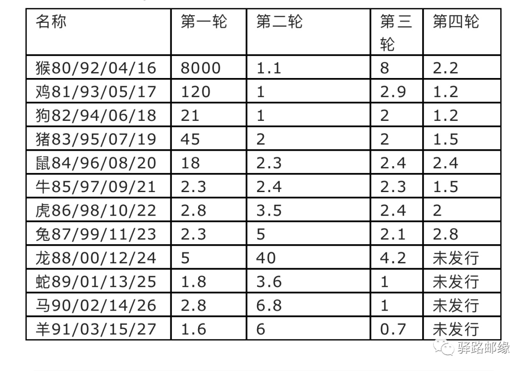 生肖票仿佛进入了一个循环,行情好一些,预定量增加,生肖票开始疯狂增量,而行情不好,又开始减量。第一轮和第三轮是前期量少,后期量大;第二轮和第四轮是前期量大,后期量少,相信第四轮后面的几个生肖发行量可能还会更少。