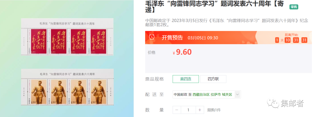 同理,65元的《雷锋》版票册,在雷锋邮票上涨后,估计关注度大大提升,根据中国集邮消息,3月5日首发直播,这次不在小程序直播了,终于向着出圈的渠道努力了...而且每人限购5版...有兴趣的邮友可以关注下。
