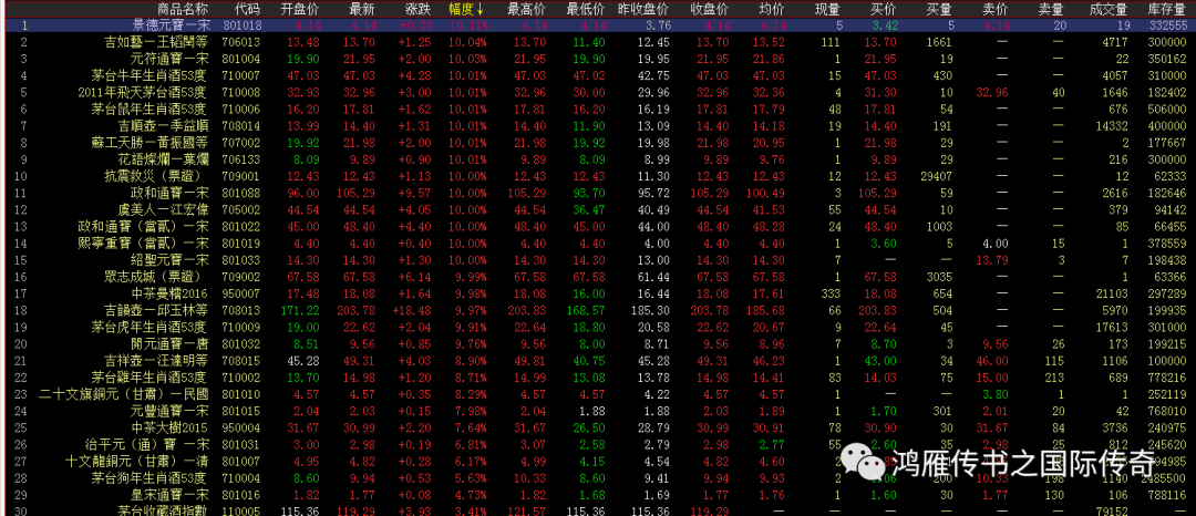 吉系品种今日全新飘红,吉韵壶经过反复拉扯,今日终于封板涨停,依然看好该品种突破200震荡上涨;至和通宝也是反复震荡,今日红盘上涨,继续保持关注,吉系重点运作品种;其他吉系品种也争先巩后封板表现,或许未来也是明日之星呢?收藏品还有更多热点,前有鸟巢蓝天、虞美人后有两个票证,走势比较暴力,都是以小博大的品种;古钱币依然还是要看政和两个品种,重点关注。