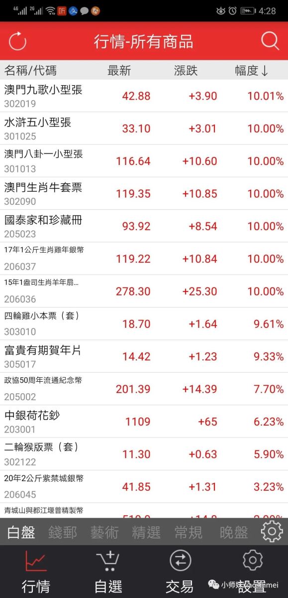 国文市场进入个品表现的阶段。朱系水浒五小型张,八卦一小型张继续保持涨停板;泉藏系国泰家和珍藏册,收住涨停板,政协纪念币有发布会活动,涨幅可观;澳门九歌,澳门生肖牛,异军突起。澳门板块,曾经是国文管理层努力推送的一个板块,后续如何,继续观察。
