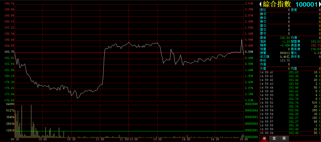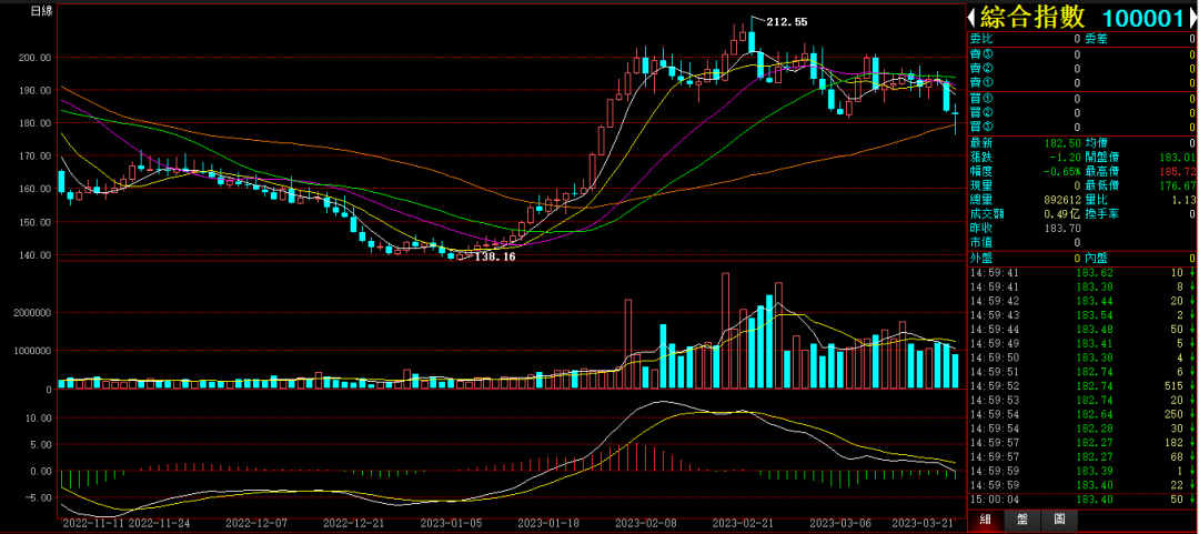 行情综述:国文今天开盘跳水,60日线位置反弹,小幅收绿。综合指数收盘下跌-0.65%,收在182.50。成交0.49亿。最高点185.72点。最低点176.67点。