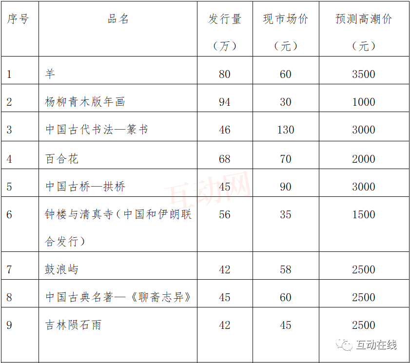 将来,03年小版张邮票系列具有长期走牛的品牌效应;发行初期先是打折,后来渐渐显露出的品牌效应,必将成为邮票的一面大旗,必将长期地、持续走牛。其瓶颈效应,24个品种的发行量在40万版至100万版之间,构成了中华人民共和国邮票超低量小版张邮票版块系列。只有03年小版张邮票系列的大幅上升,才能推动编年邮票板块的上涨。2006年一名资深集邮人士曾给出03小版张邮票系列未来价格预测,有部分邮品大潮的时候的价格已超过。根据现在邮市的发展我再来做个预测(附后)。