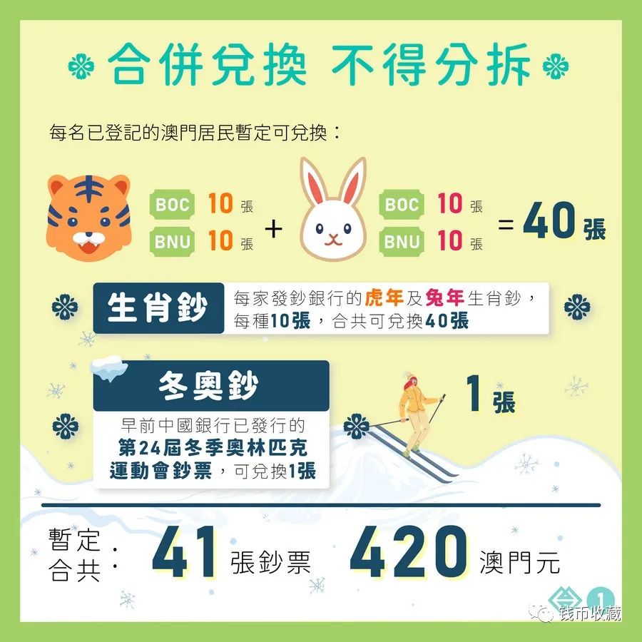 每家發鈔銀行供居民兌換的每一生肖鈔暫定為10張,即合共可登記兌換40張(兩家發鈔銀行的兩種生肖鈔);同時,早前中國銀行已發行面值貳拾圓的第24屆冬奧鈔票,暫定每名澳門居民可登記兌換1張。每名澳門居民僅可登記一次,兌換的鈔票將包含兩種生肖鈔共40張及冬奧鈔1張,合共可兌換數量為41張,不可分拆兌換,實際兌換數量將視乎最終登記人數而定,並於登記期完結後另行公佈。
