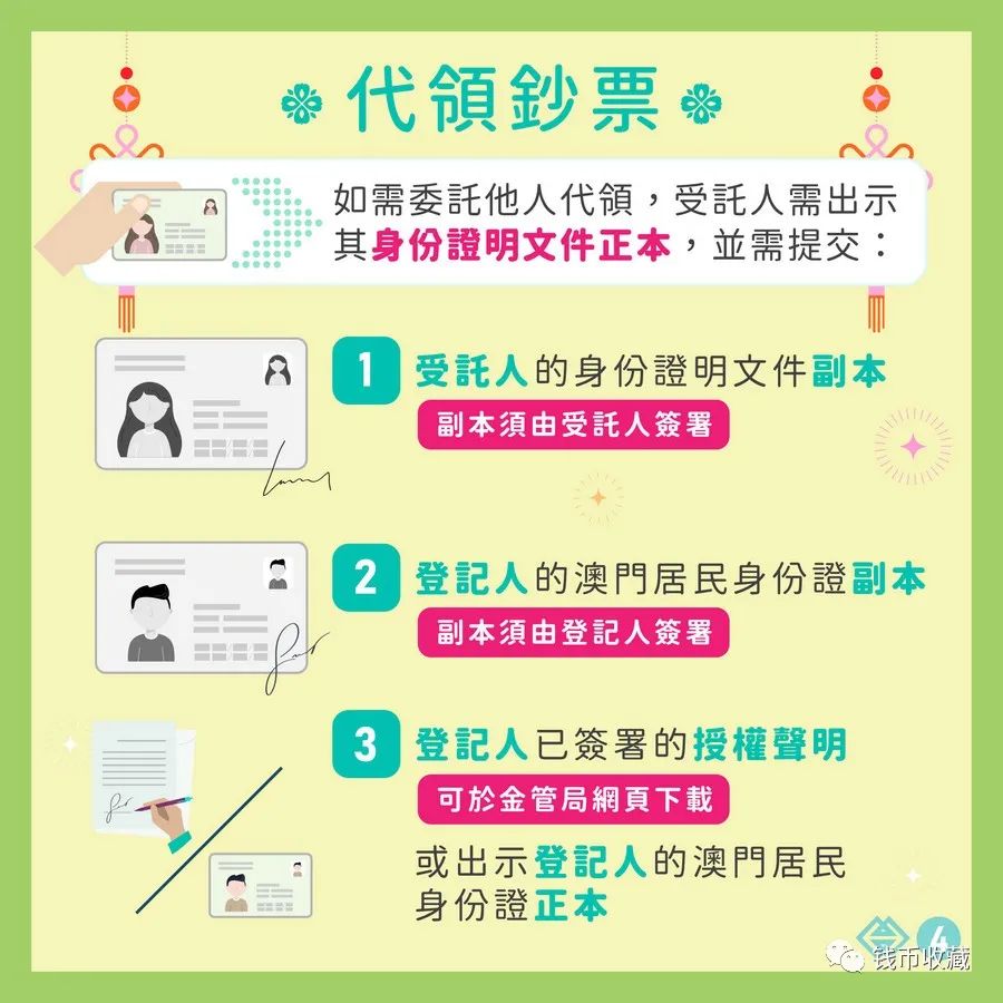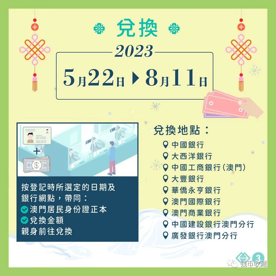 兌換期為2023年5月22日至8月11日,兌換地點包括中國銀行、大西洋銀行、中國工商銀行(澳門)、大豐銀行、華僑永亨銀行、澳門國際銀行、澳門商業銀行、中國建設銀行澳門分行及廣發銀行澳門分行的指定網點。居民可按所選定的日期及銀行網點,帶同其澳門居民身份證正本及兌換金額親身前往兌換。如需委託他人代領,受託人則須帶同自身的身份證明文件正本以及提交下列經簽署的文件: