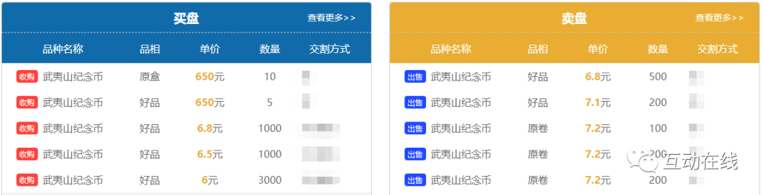 ▲武夷山纪念币买卖盘