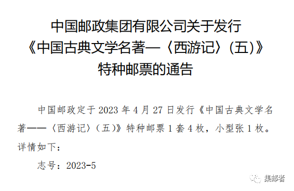集邮者讯(JiCang.vip),昨天看到国家邮政局的审批公告,小集就预计发行公告应该快出了,极大概率会有全票张,果然今天就实锤了!中国邮政正式公布了新邮《西游记五》的发行公告!