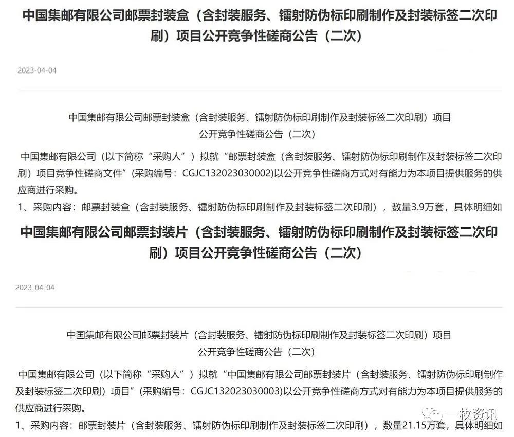 近期中国邮政对外招标,计划采购封装盒3.9万件,封装片21.15万件。