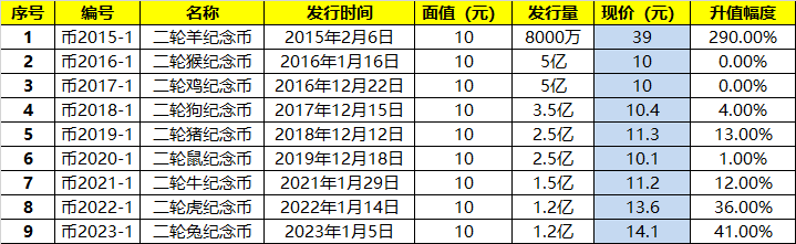 我们可以看看下面的表,9枚二轮生肖币如今的市场表现如何了。