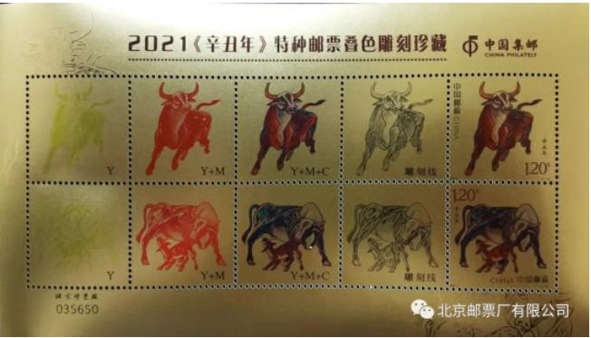 《辛丑年》特种邮票叠色张应用了新型多层黄金薄片工艺。区别于其他薄片类黄金产品,通过在基体层和图案层之间设置金属箔层,使印刷品具有金属质感,且黄金面不封膜,不易损坏,让用户可以直接获得质感体验。不仅能够有效防伪,更具有保值、鉴赏、纪念及收藏价值。