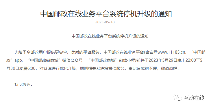 邮政发布公告,将于5月29日22:00至5月30日凌晨6:00进行系统维护,暂停服务,特此公告: