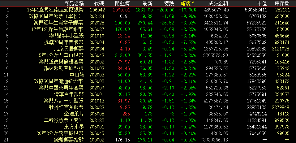 2、《政协40周年邮票(单枚)》反弹中连续跌停,跌破5日线,观望。