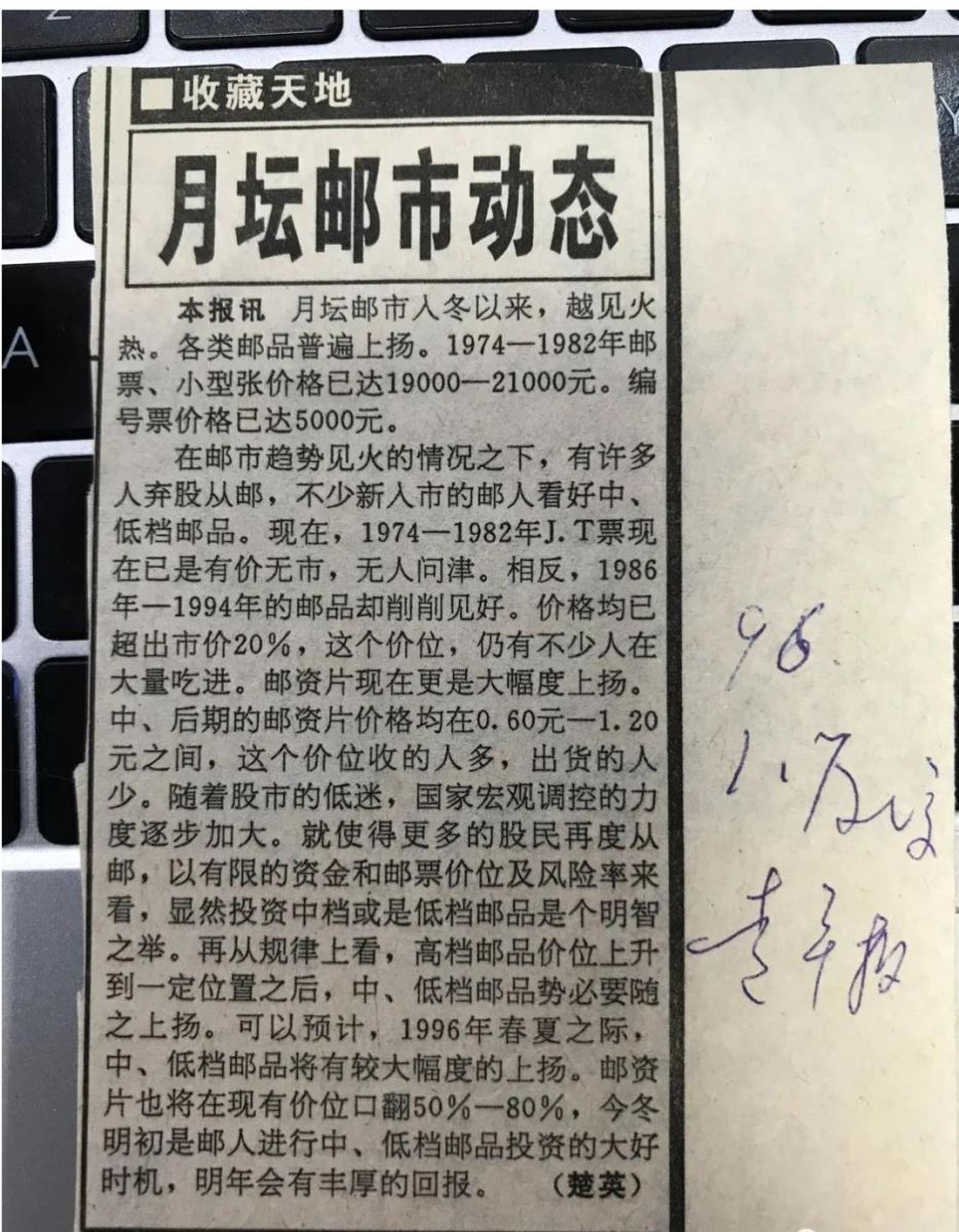 这是一则发表于上世纪90年代的剪报,报道了月坛邮市的最新动态,报导了邮市在歇夏入冬后邮市火热,各类邮品普遍上涨。其中有两个错别字,现在读来,集邮爱好者怎么看?