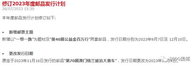 澳门修订“2023年度邮品发行计划” 日期:2023-07-29 来源:澳门邮电 近期澳门邮电公布其修订“2023年度邮品发行计划”,增加了两套邮票发行,修改了一套邮票发行时间... 近期,澳门邮电公布了其修改的“2023年度邮品发行计划”: 9本年度澳门邮电将增加两套邮票发行,依次为: 月7日增发“一带一路”题材邮票; 12月10日增发“第40届公益金百万行”题材邮票 并且将原计划11月16日发行的“第70届澳门格兰披治大赛车”邮票发行时间修改为11月9日。