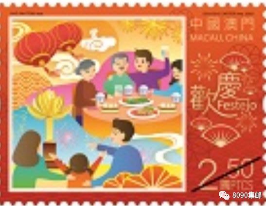 面值2.5澳门元邮票图案为一家三口在金莲花广场与阖家团圆的场景,边框点缀烟花,红扇与传统纹饰,彰显东方传统节日氛围;