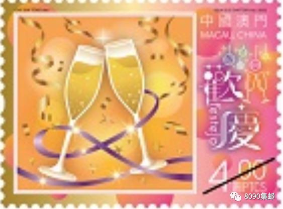 面值4澳门元的邮票图案主图为香槟杯与彩色飘带,边框采用气球与霓虹灯的纹饰,给人一种西方节日的氛围。