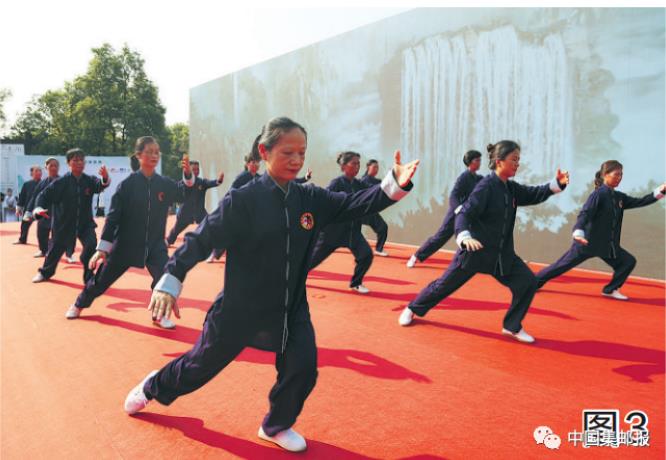 《太极拳》特种邮票承载了丰富而深厚的道文化内涵,凝聚了鹰潭“中华道都”的文化精髓,体现了中华传统文化的独特魅力。邮票首发活动同时举办了江西省集邮展览,展出体育运动、青山绿水等专题邮集60框。此外还有太极拳表演(图3)、舞蹈表演、“哪儿都通”幸福快递活动、汉服快闪活动、“学子嘉游赣”活动、龙虎山攀岩公开赛以及农产品直播销售等丰富多彩的内容。(吴可新 鑫浩 桂云峰)