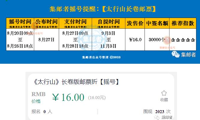 集邮者讯(JiCang.vip),今天集邮网厅公布了《太行山》长卷版邮票折的摇号消息,售价16元与小集之前预计的基本一致。而这次中签指标大幅提高!