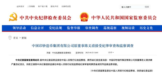 中国印钞造币集团原董事陈义清被查 日期:2023-08-22 来源:中央纪委国家监委网站 据中央纪委国家监委驻中国人民银行纪检监察组、陕西省纪委监委消息:中国印钞造币集团有限公司原董事陈义清涉嫌严重违纪违法,目前正接受中央纪委国家监委驻中国人民银行纪检监察组纪律审查和陕西省咸阳市监委监察调查。 来源:中央纪委国家监委网站