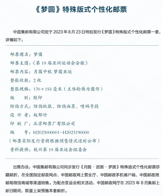 以下节选中国集邮公号内容:继《杭州第19届亚运会》特殊版式个性化邮票双连张、《千年宋韵 时代亚运》绢质扇形个性化邮票之后,中国集邮有限公司再度融合传统文化和时代潮流元素,重磅推出《梦圆》特殊版式个性化邮票和《月圆·团圆》特殊工艺纪念张,在月圆之夜、以方寸之名献礼亚运盛会,祝贺杭城圆梦亚运,祝福运动员圆梦赛场,祝愿亚洲人民团结向前、共圆构建人类命运共同体之梦。