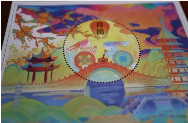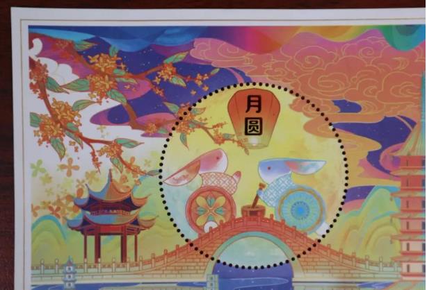 《梦圆》邮票采用荧光工艺体现“一票双景”的视觉效果,紫光灯下可见的曲水流觞和体育图标图案,与天空中的明月、孔明灯以及月光下的杭城建筑,共同构成了一幅亚运中秋夜的良辰美景。