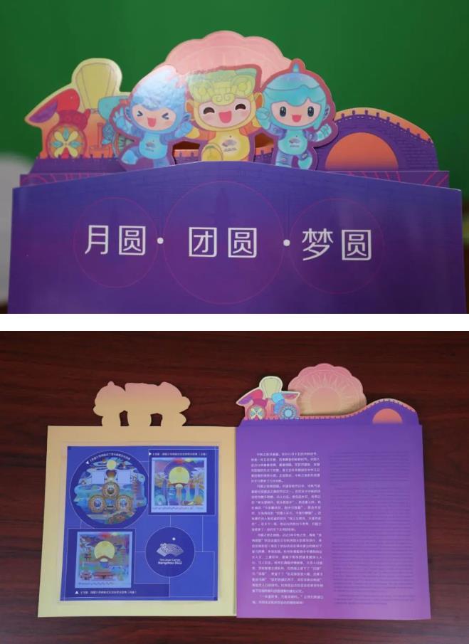 邮折内页分别展示邮票、纪念张及其荧光效果,顶部分别提取邮票、纪念张里的主要设计元素,形成有层次感的亚运中秋图景。