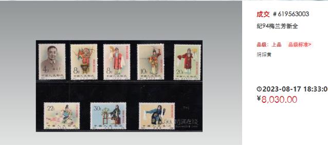 前几天,老赵上一套梅兰芳新票拍卖,成交价格为8030元,这个品相还是上品,阴阳黄。全品的话,要在25000元左右,比昨天讲的黄山、蝴蝶都要贵。梅兰芳邮票作为老牌的六珍之一,价值不凡,令人叹为观止。
