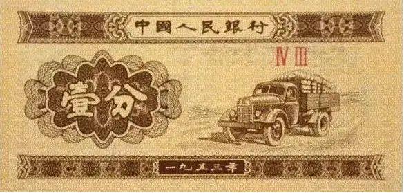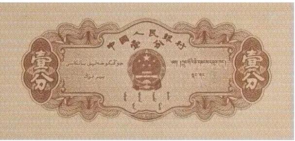1分纸币,两版主颜色都为米黄色,正面图案为解放军军车,背面为国徽和中国人民银行的汉、蒙、维、藏四种文字图案,尺寸长90毫米,宽42.5毫米。