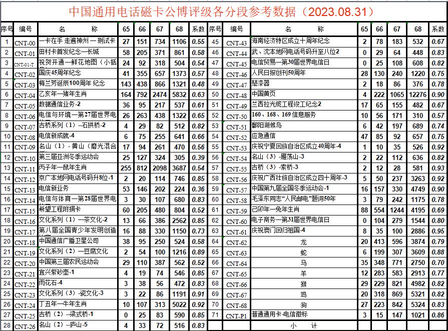 中国通用电话磁卡公博评级各分段参考数据(2023.08.31)