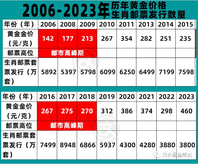 2023年的贵金属市场,黄金基本保持在每克460元左右的历史高位,黄金是国与国之间交易的压仓石,往往在互不信任,形势不稳的时候凸显出“真金白银”的安全感。我们回顾黄金在这十五年来的市场价,就知道它也是跌宕起伏,跟市场大环境息息相关,也在某个侧面体现了“盛世收藏,乱世黄金”的说法。比对一下邮票在黄金高位时期的市场表现它们刚好是反向而行,邮市的高峰期都处在黄金的历史低谷稳定期。