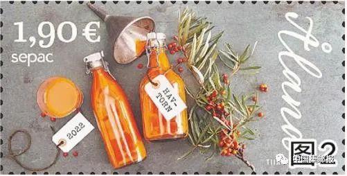 奥兰群岛2022年9月6日发行的《2022年sepac》邮票获得本次评选活动的第2名(图2),邮票展示的是奥兰群岛本地的天然沙棘浆果和制作好的瓶装沙棘原浆饮料。