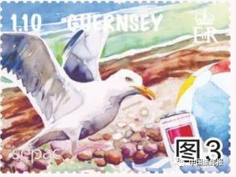 获得第3名的是根西岛于2022年6月22日发行的《2022年sepac》邮票(图3)。这枚“sepac”邮票同样也是全套4枚中的一枚。全套邮票分别描绘了“偷食”面包、鲭鱼、啤酒和冰激凌的根西岛海滩上常见的鸟银鸥。其中“sepac”邮票上展示了根西岛的兰多尔斯啤酒厂生产的本地啤酒。