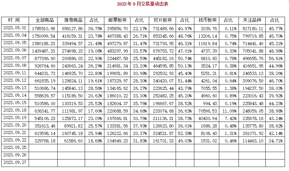 @所有人 说说《交易量动态表》,通过这张表就可以看出这个月以来总的交易额情况,掌握其运行规律。每天的交易额又分布在推荐商品、邮票、封片、钱币4大块,那一块的资金占比高,就说明这个板块的热度要比别的板块高,交易额大,可能参与的人数也越多。然后根据自己的持仓进行操作。大家看我这样分析对不对?