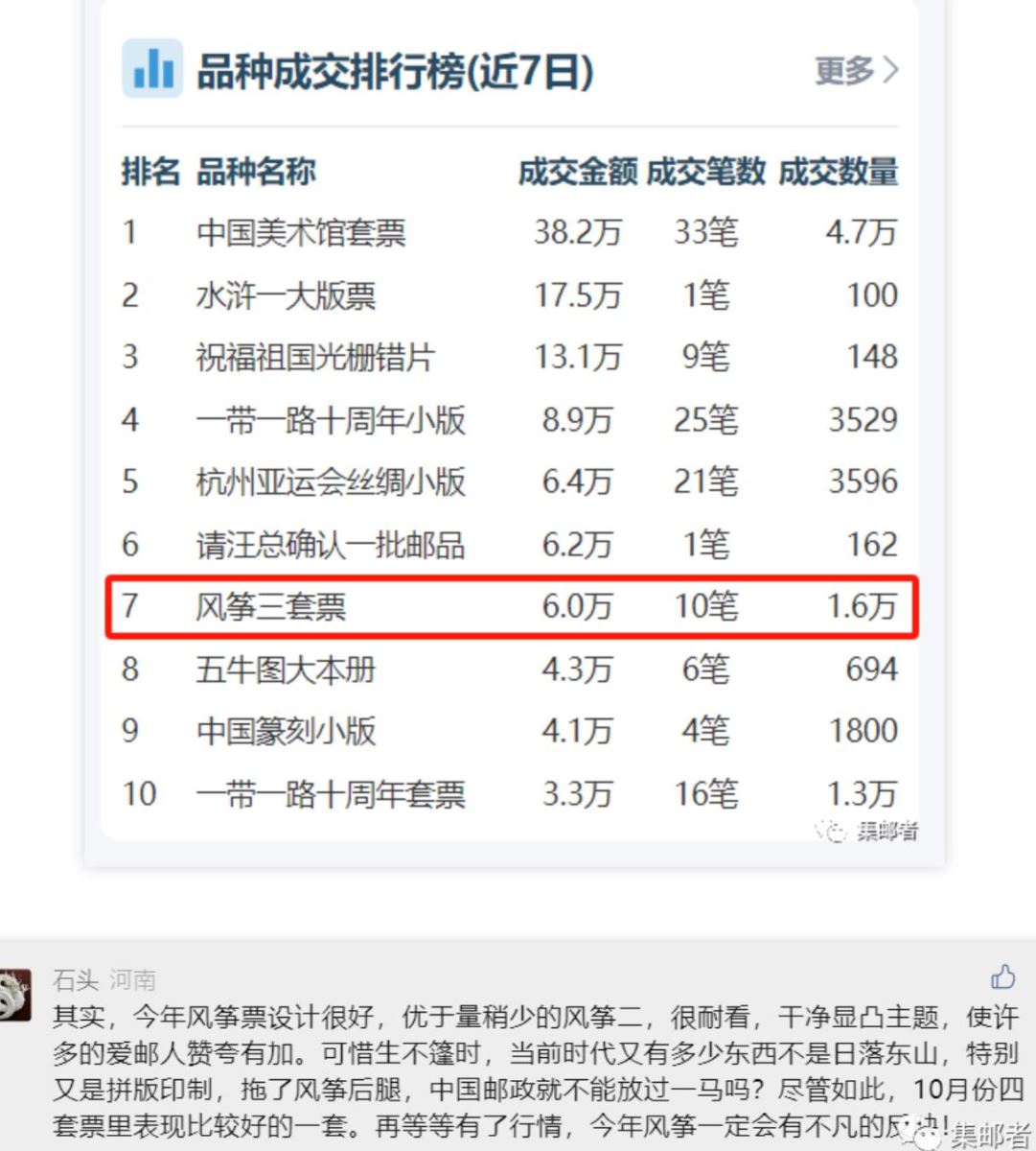 新邮《风筝三》从骨折一度涨至接近面值,你觉得实物好看吗? 日期:2023-10-07 来源:集邮者 集邮者讯(JiCang.vip),大宗平台上《风筝三》邮票,从开盘的骨折2.7元,一度最高涨至4.7元,接近4.8元面值价,虽然现在又跌至4元左右,但成交量明显提升,成为邮币大宗平台的一周成交榜第7名: 也有邮友留言,风筝三邮票实物挺不错的,不知道邮友们拿到手觉得这套邮票的实物如何呢?
