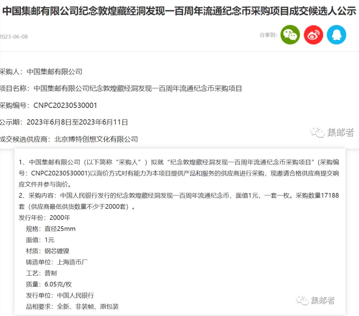 集邮者讯(JiCang.vip),之前介绍过前段时间推文介绍过"PNC票币封",这几天小集发现,集邮总公司的最新的招标公告《纪念敦煌藏经洞发现一百周年流通纪念币》已公示,发行量应该也是定了下来了。