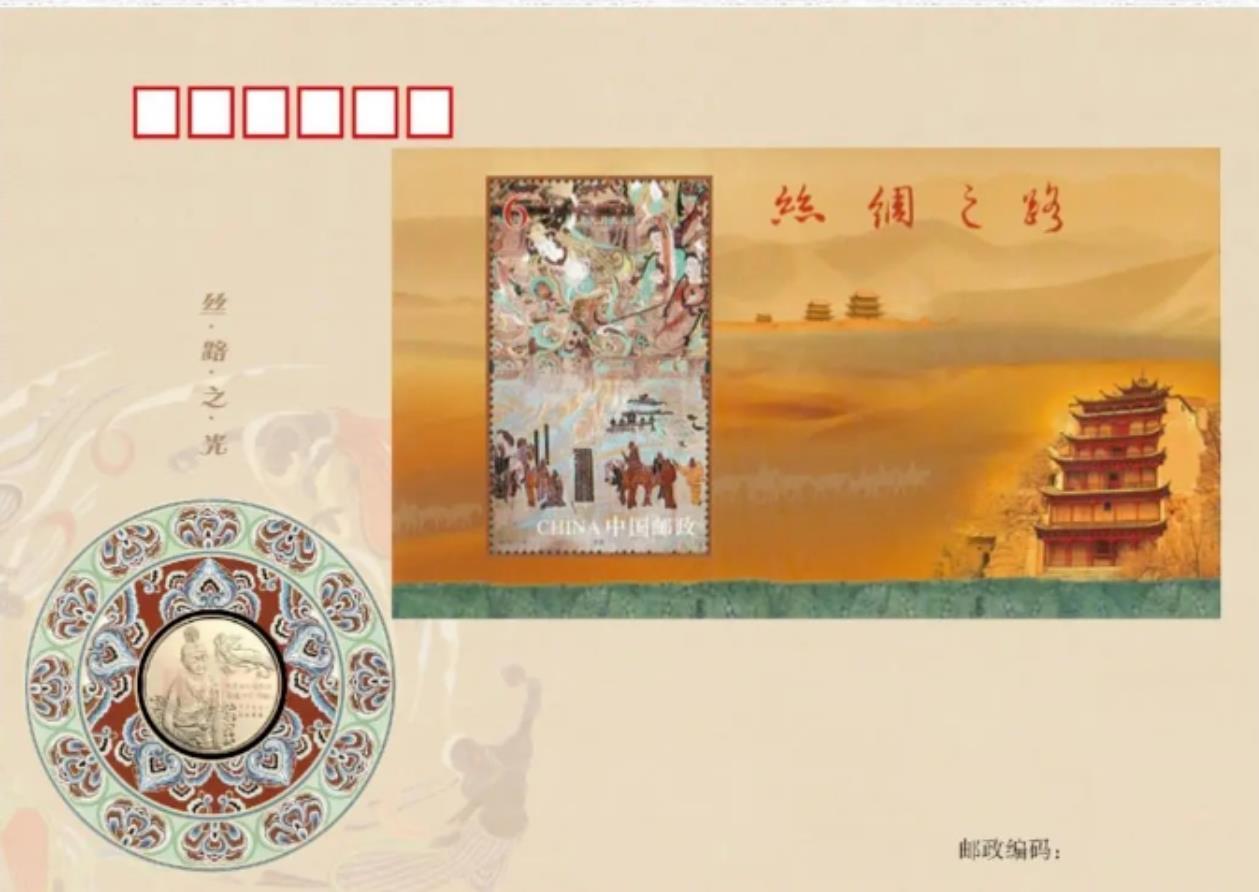 这枚邮币封使用:中国邮政发行的2012-19M《丝绸之路》小型张、及中国人民银行发行的《纪念敦煌藏经洞发现一百年纪念币》1枚