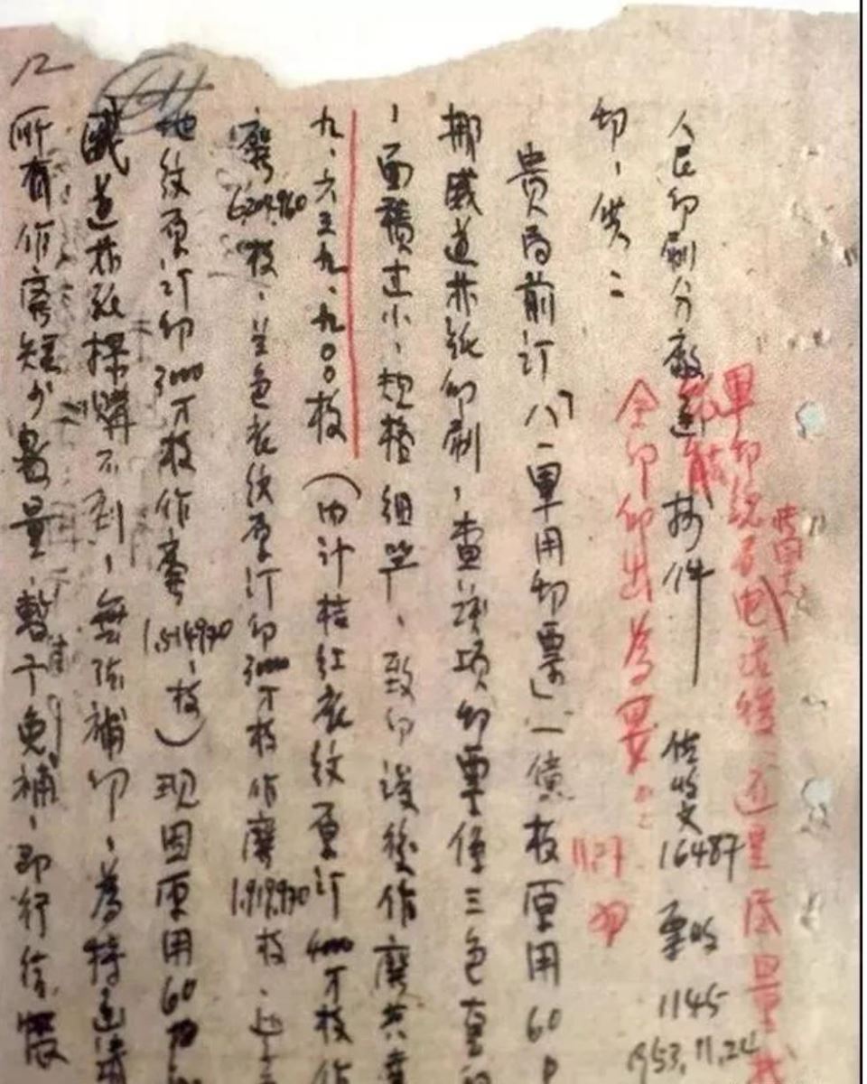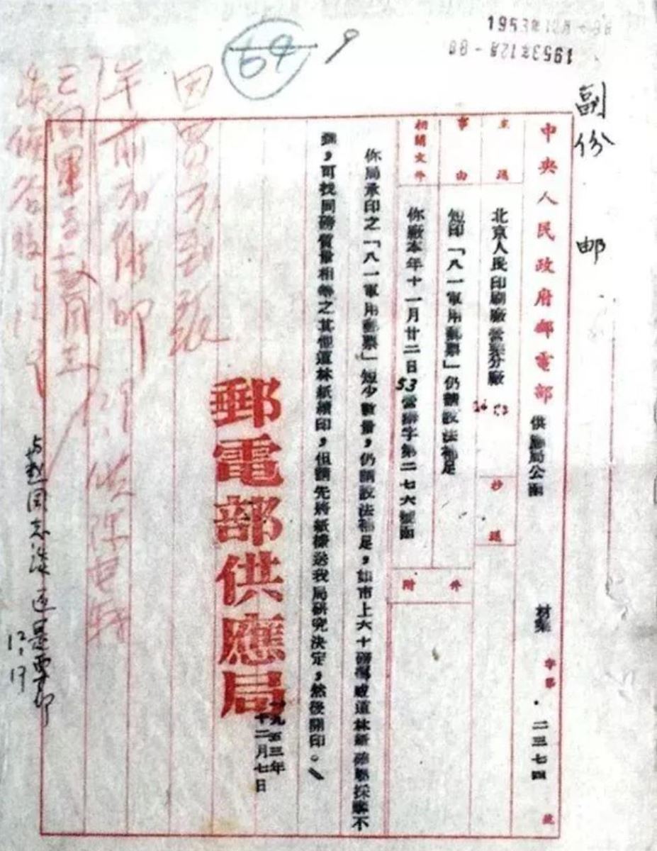 从上图中的这份1953年11月24日的抄件中,我们看到人民印刷厂曾致函邮电部供应局,讲述了该一亿枚邮票在印制时,共计作废了9639900枚。其中黄军邮(函件中称之为桔红底纹)作废6204960枚,紫军邮作废1514970枚,蓝军邮作废1919970枚。