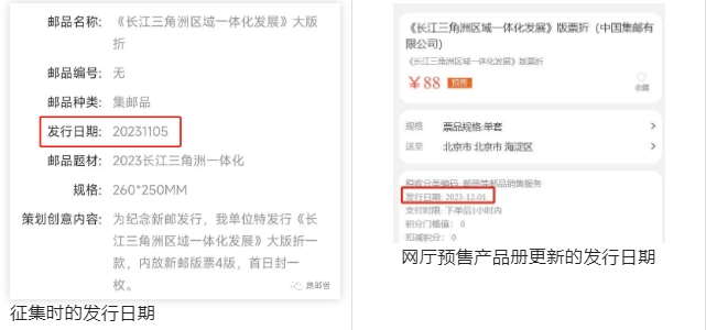前几天推文:关于新邮《长江三角洲区域一体化发展》发行时间定了,即将预售→,当时地方邮局征集的日期在11月5日,但集邮网厅邮总上新的的发行日期改为2023年12月1日。