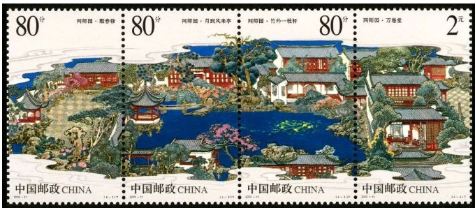 这套邮票发行于2003年6月29日发行,真正的20年前经典风景票,2003票是编年中的经典,这套网师园又是经典中的经典,取竖幅画面,以横连印刷的形式,全景式地展示出名园风貌,4枚邮票分别以所包含的主要景点取名为分别为"殿春簃"、"月到风来亭"、"竹外一枝轩"和"万卷堂"。
