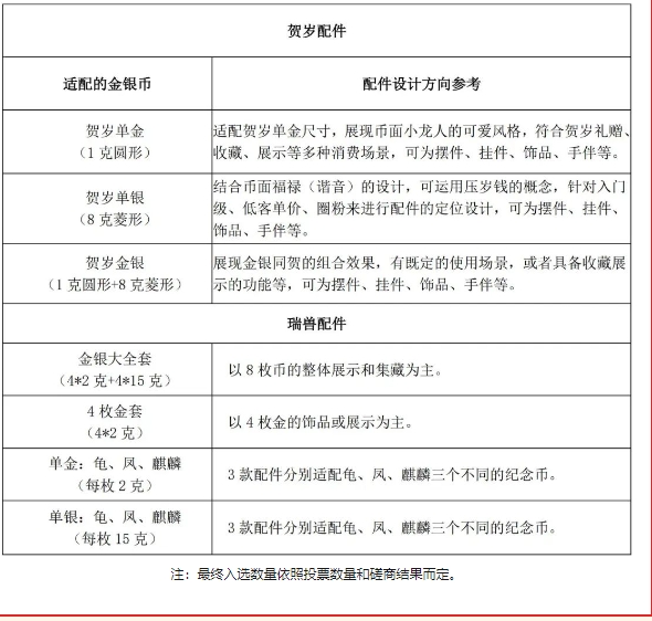 4.形式不限,需与金银纪念币相结合,可为首饰、徽章、摆件、手办、吉祥物、节日礼品、纪念品或其他。