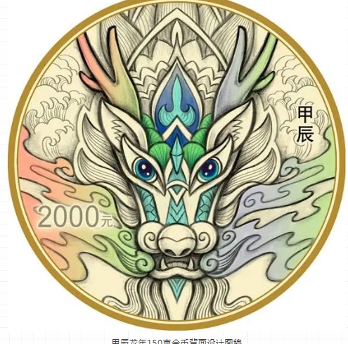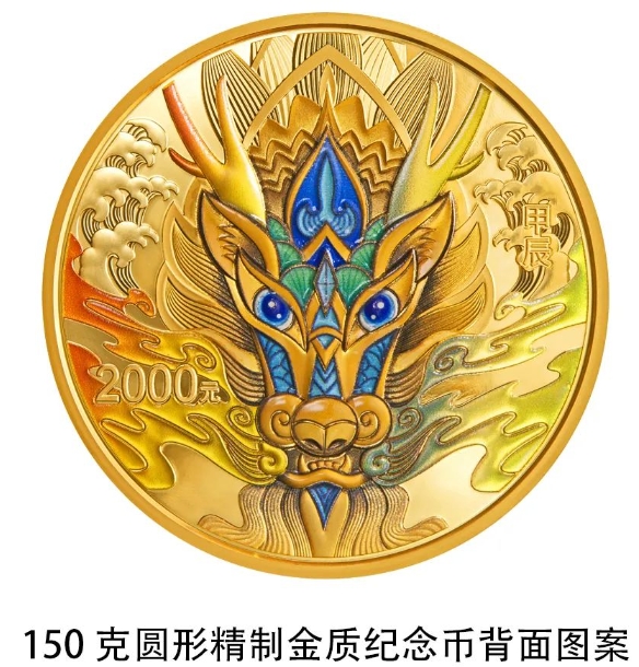 2024中国甲辰(龙)年贵金属纪念币项目共有12个规格,其中150克圆形金币背面图案为装饰龙造型,衬以水纹组合设计,并刊“甲辰”字样及面额。主图案由装饰风格龙头造型构成,极具设计感与视觉冲击力。