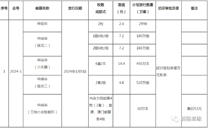 《甲辰年》生肖邮票将于2024年1月5日发行,全套邮票2枚,图案分别为“天龙行健”和“辰龙献瑞”。《甲辰年》生肖邮票图稿已于10月下旬发布,近日网上传出发行量将减少的消息,《甲辰年》套票比上一年生肖邮票减量约802万套,减少21.1%;小版张减量约50万套,减少21.7%。此外,《甲辰年》小本票仅用于集邮有限公司集邮品开发,数字藏品版式二仅用于全网摇号及集邮有限公司指定集邮品,三地生肖特殊版式小全张仅用于全网摇号及集邮有限公司产品开发。适度保障新邮预订用票量及零售用票量,积极发展新用户和青少年群体,满足广大集邮者零售票需求。