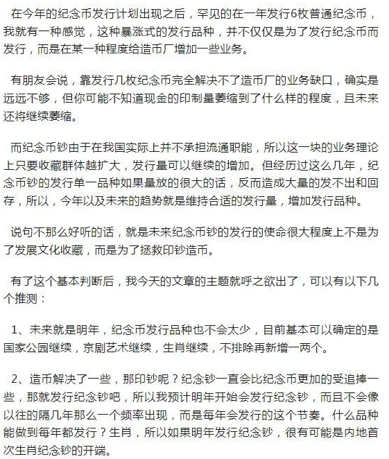 所以我认为发行方最直观的参考数据是回存,因为他们最怕的也是出现回存。第二点,鉴于纪念币钞钱币市场的现状,以及考虑生肖钞需要发行12年一轮的考虑,第一枚必须一炮而响,才能顺利的发行之后的生肖,且为了保持一个系列的稳定性不要再有一看不对再缩量这样的做法再次出现。