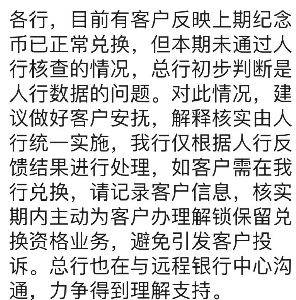 可是,意外情况又出现了,正当预约者兑换无门,收货的兴高彩烈的时候。央妈发的一则通知,就象冬天里的一把火,让所有预约的藏友感受到了央妈的温暖:一切问题都是我们的问题,你们放心,你们反映过来的马上解决,没有反映的主动联系你们解决,并且我们要自查出现的问题,尽量让大家都取到币不给大家添麻烦!