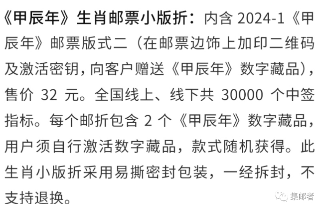 创新的尝试,这个必须要力挺,无论成功或失败,不断的迭代才有进步,因此对于中国邮政四轮龙小版折赠送数字藏品及新的包装下,小集还是比较期待的。