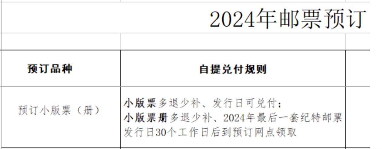 今天下午快下班时,一位邮Z朋友告知,看了2024年一月份预订票类的工作计划表,发现2024年各种预订品种都比去年少,但差别不大,可是,2024年预订小版票的入库计划数约少了40%!!