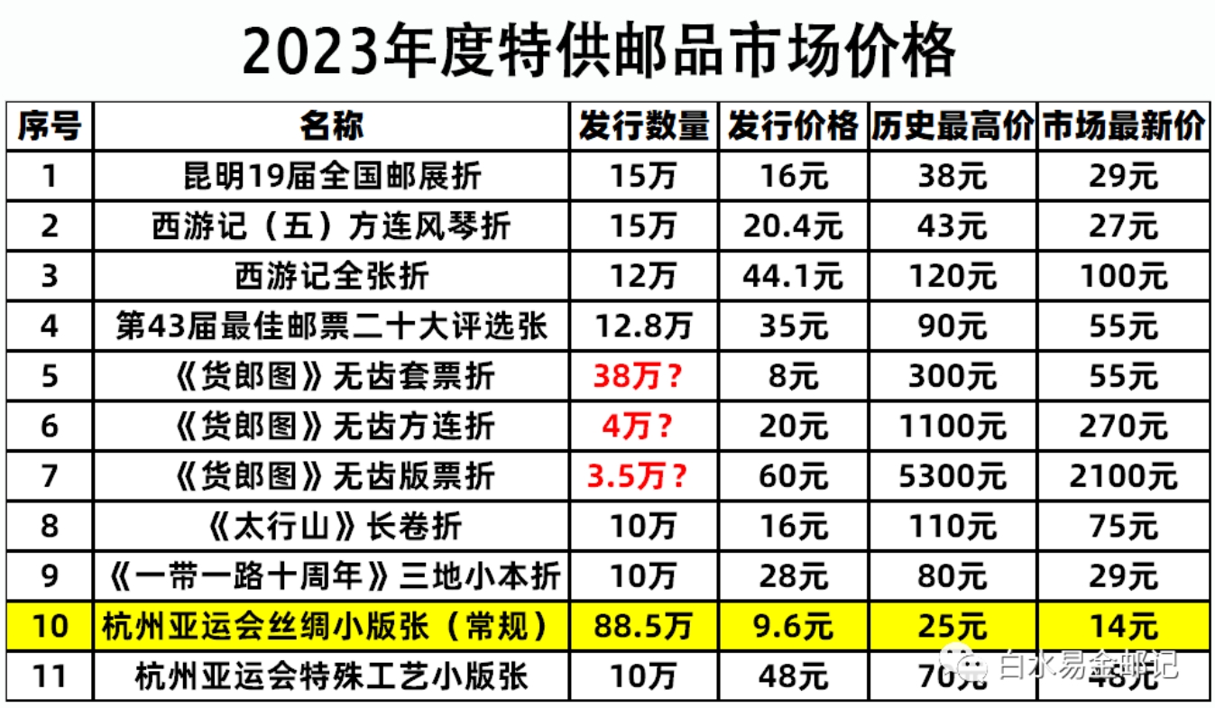 2023年应该是特供邮品发行品种最多、摇号抽签销售次数最多的一年。发行量也从2023年年初15万逐渐下降到后期的10万。摇号给客户购买数量也从年初的发行量10%,调整到后期的30%。市场价格在发行数量缩量保障和控盘下,2023年特供邮品市场价格比发行价溢价1倍以内的品种有5个,其余6个都是高于1倍以上的溢价。溢价最高冠军是《货郎图》无齿套票、方连、大版折,尤其是无齿大版目前是35倍(最高价时是80多倍)。溢价垫底的是杭州亚运会特殊工艺小版折,接近发行价格。如果在2023年有资格且抽中购买确实让人开心,摇到就是赚到。为增加2024新邮预订参与率,更是按预订连续年龄、参与预订年龄等给予系数加持,摇号购买特供邮品的方式吸引群众参与预订,能抽中保证自己购买的年册不亏...。