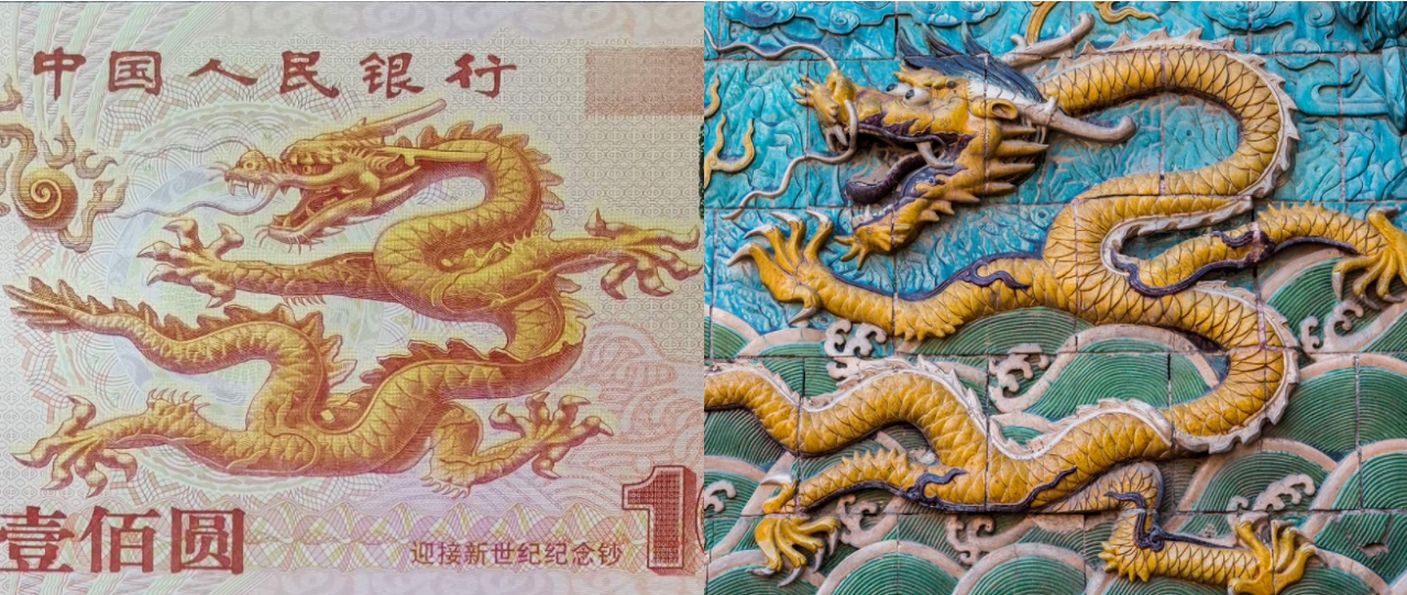 从样式上看来,龙年纪念钞上的龙取材于北海九龙壁上升龙,颜色上以金黄为主,碧绿加以衬托,有着金碧辉煌之意。