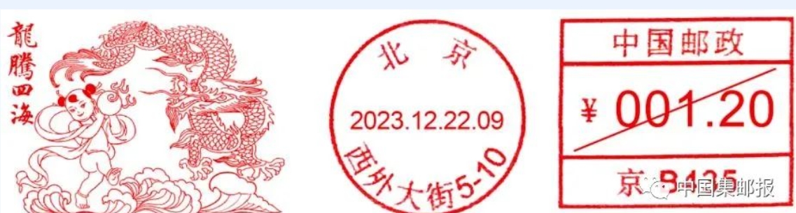 为迎接甲辰龙年的到来,12月22日,北京邮政在北京西外大街邮政支局推出“龙腾四海”邮资机宣传戳。