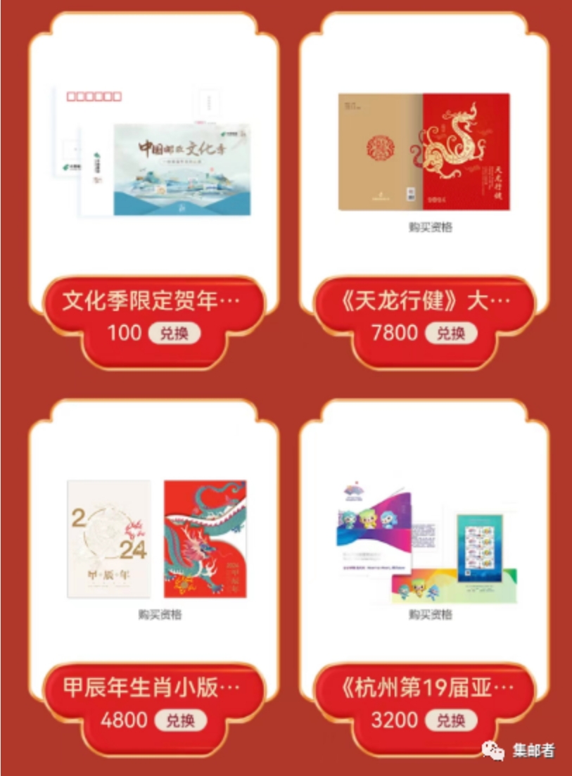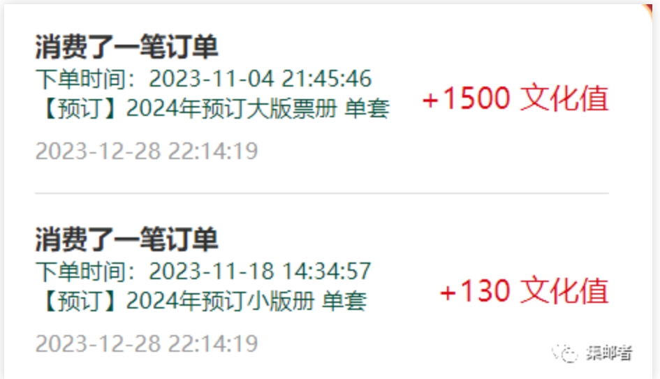 上次小集整理的时候查看文化值中,没有2023年新邮预定给的积分。但今天集藏者社群邮友发现,2024年新邮预定给了文化值积分!因此新邮预定也给文化值的,对于邮友来讲是件好事。快看看可以兑换啥吧...