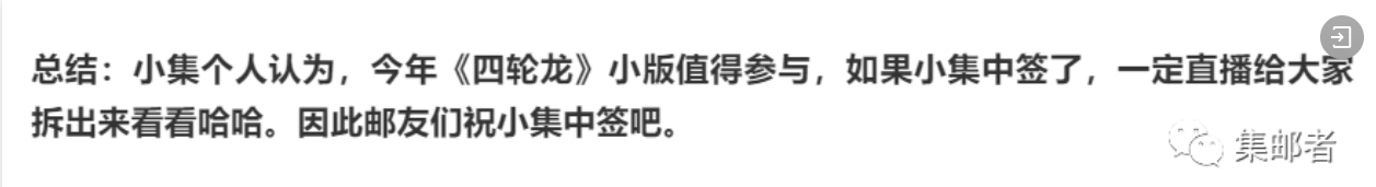虽然小集没中签,但为了满足小集和邮友们的好奇心,小集还是打算高价购买四轮龙小版折,到时候给邮友们直播看看这个怎么玩!